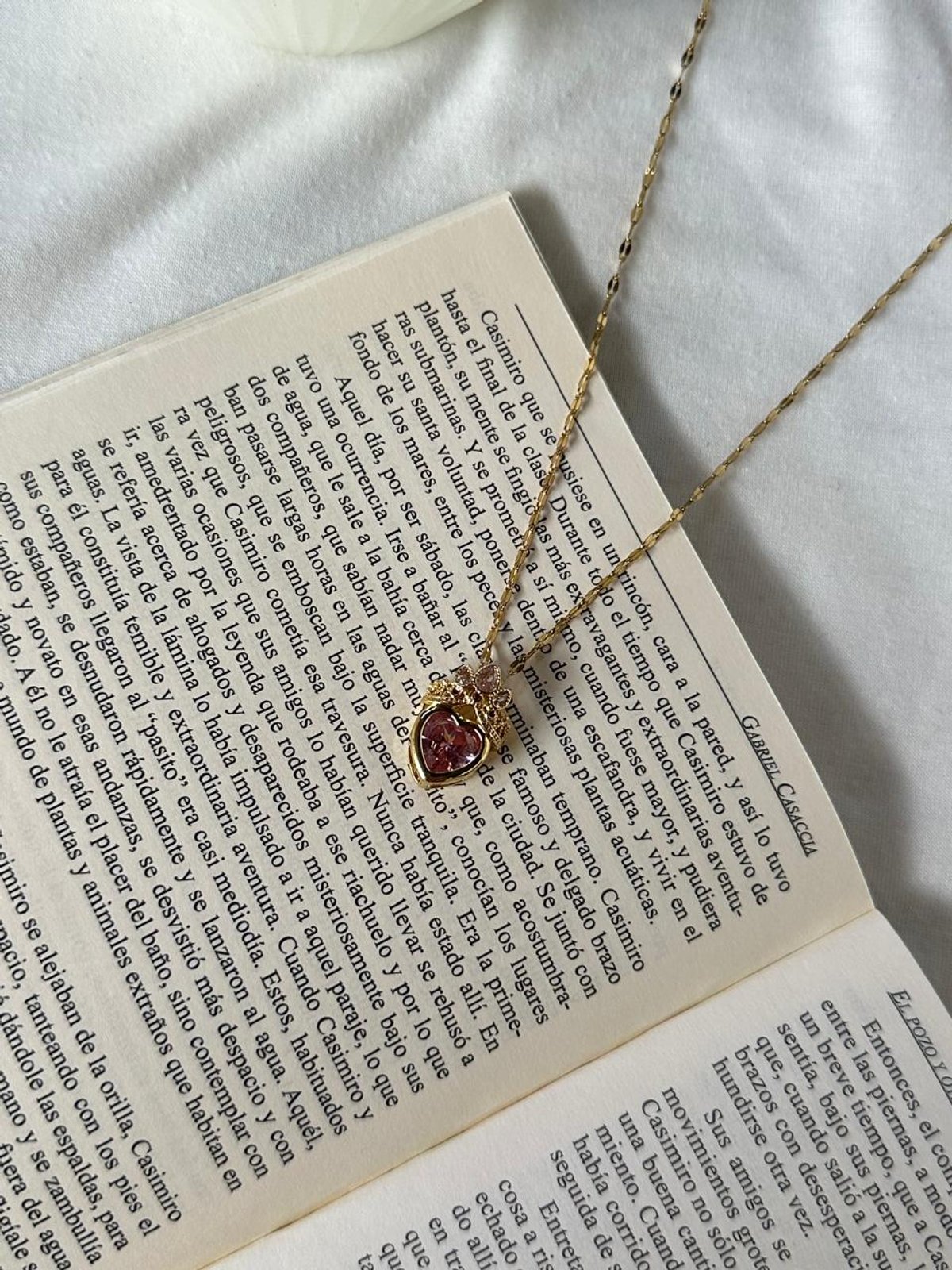 Detalles: Dije de corazón en cristal rosado vibrante, coronado con una tiara detallada en minicristales. Cadena de eslabones planos tipo espejo.
