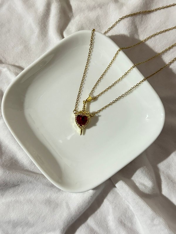 Detalles: Este juego de collar presenta un colgante único con una gema roja vibrante en forma de corazón. Una intrincada daga dorada atraviesa el corazón, creando un diseño llamativo y significativo. Viene con dos cadenas a juego, perfecto para compartir con un ser querido.