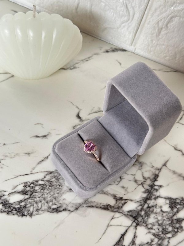 Detalles: Cuenta con una deslumbrante piedra central en tono rosa intenso, rodeada por un halo de cristales que también decoran la banda del anillo, capturando la luz desde cualquier ángulo.