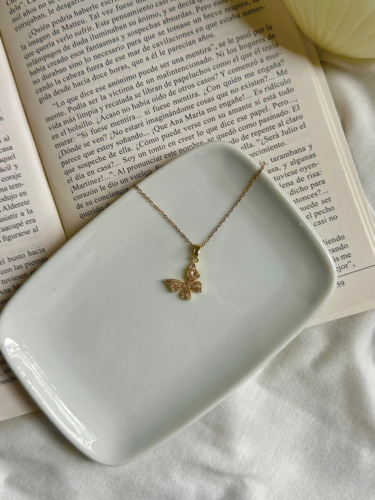 Detalles: Es una cadena fina con un dije de mariposa que tiene un diseño con huequitos y piedritas brillantes en las alas. No pesa nada y es muy cómoda.