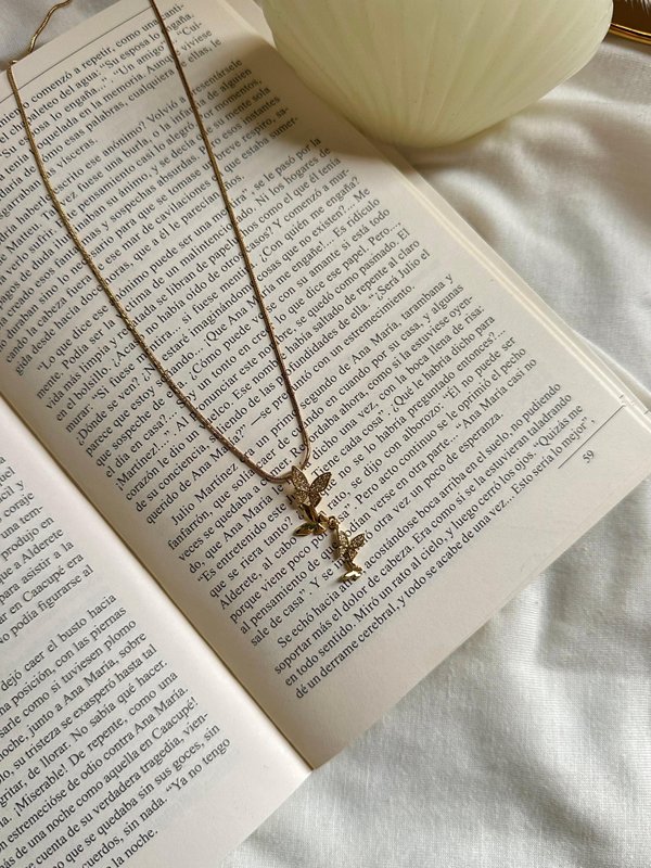 Detalles: Esta cadena se destaca porque tiene tres mariposas de diferentes tamaños que cuelgan una debajo de la otra. La de arriba brilla y las de abajo son lisas.