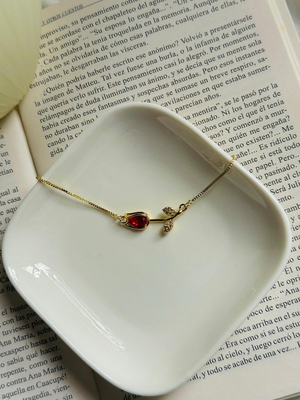 Detalles: Es una pulsera muy delicada con un dije de tulipán en el centro. La flor es una piedra roja brillante y tiene hojitas con pequeños brillos. Es ajustable y queda muy fina en la muñeca.