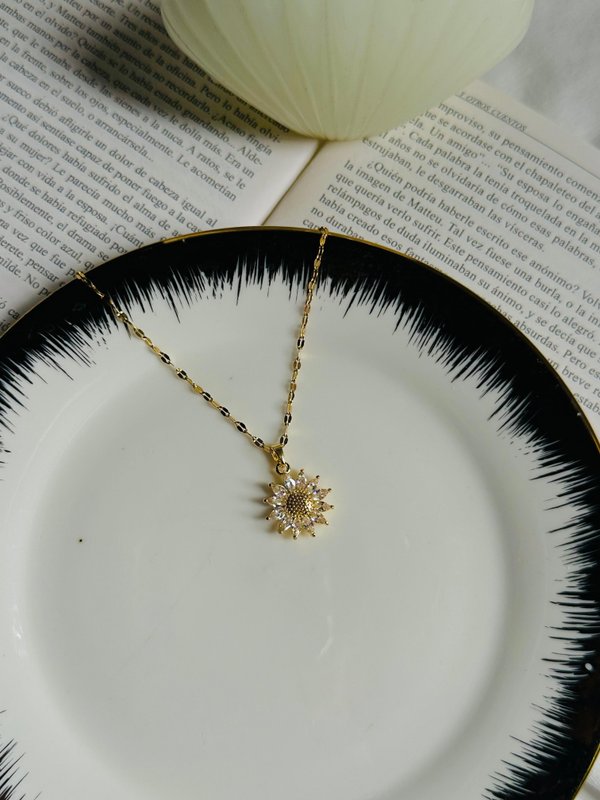 Detalles: Una cadena con un dije de margarita cargado de piedras transparentes que brillan mucho. El diseño tiene pétalos bien definidos y es muy resistente, ideal para usar siempre porque no pierde el color con el tiempo.