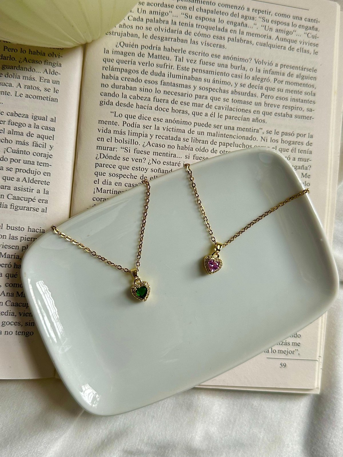 Detalles: Cadena clásica con dije de corazón en color verde o rosado. El borde tiene piedritas brillantes que resaltan el color de la piedra central. Al ser de acero, podés usarla tranquila que mantiene su brillo.